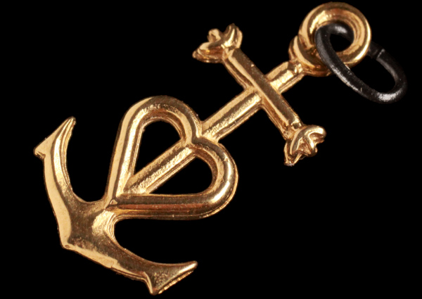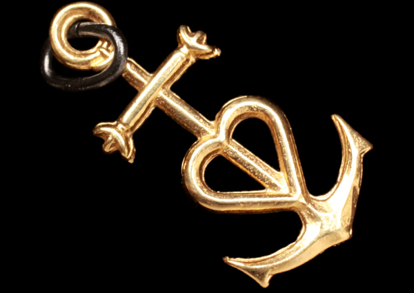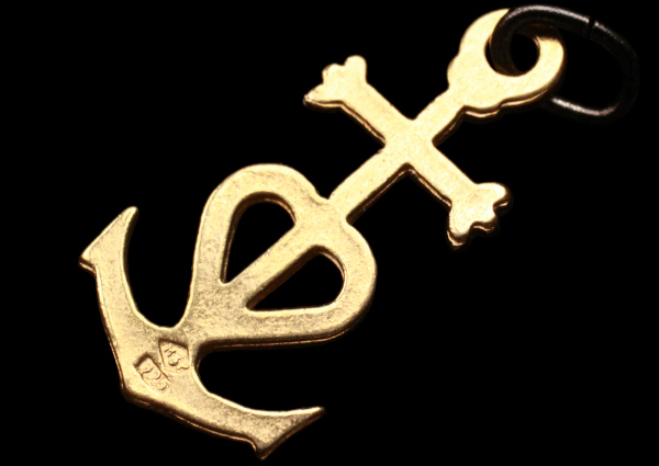 信仰を表す十字架、希望を表す錨、愛を表す心臓を組み合わせた南仏カマルグのシンボル、クロワ・カマルゲーズ(カマルグ十字)。縦二十ミリメートル、横十ミリメートルと、類品中でも小さめのサイズにかかわらず、細部まで丁寧に作った美麗な品物です。本品は金色ですが、裏面最下部に銀細工工房のマークと