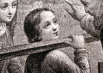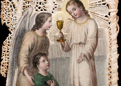 コミュニオン・プリヴェの手彩色カニヴェ 《わが子よ、わたしを呼びましたか》 (ブアス=ルベル 図版番号 1409) 趣き深い古美術品 Tu m'as appelé, mon enfant ? Bouasse-Lebel pl. 1409, 109 x 68 mm フランス 1866年