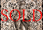 グラヴュール(エングレーヴィング)によって描いたフランスのカードで、エンボスを施したレース状の透かし細工で飾られています。紙製品ですから、金属製のメダイ等に比べて失われやすく、またレース状の部分が破損しやすいために、完品はたいへん稀少です。