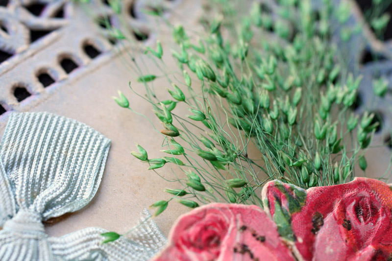 台紙の左上に結ばれたブルーのリボンは、永続する結婚のシンボルです。ふたりの手と花々を切り抜いた部分の裏側には、豊穣のシンボルである米(イネ)の代用として、瑞々(みずみず)しい緑に染めた草の穂の小さな束を貼り付けています。