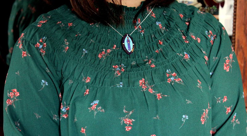 本品のエマイユ・シャンルヴェは、青を主体にしています。天空の色である青は、天国を象徴します。さらに青は智慧の色でもあります。主任司祭ゲラン神父や村の修道女たちをはじめ、ポンマンの大人たちは聖母の姿を見ることができませんでしたが、子供たちの言うことを信じて、聖母の祝福を受けました。それゆえ聖母の衣の青は、ポンマンの村人たちが示した「信仰の智慧」(信仰という智慧)を、神が祝福し給うたことを表しています。