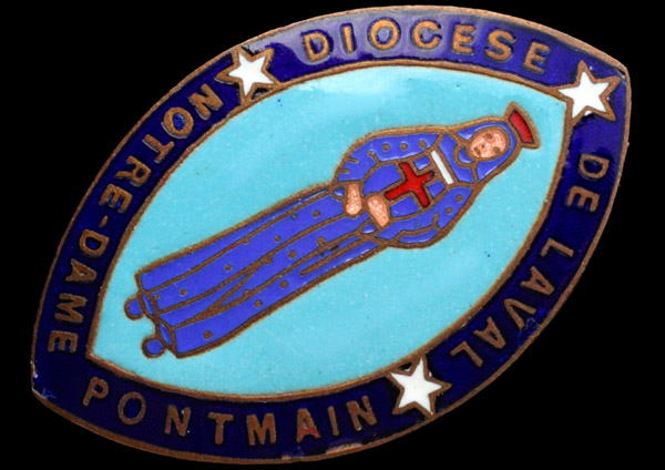 六色のガラス・エマイユによる美しいアンシーニュ。「アンシーニュ」(仏 insigne)とは所属を示す徽章(きしょう、ピン)のことで、本品はラヴァル司教区が組織した巡礼団のものです。ラヴァル(Laval ペイ・ド・ラ・ロワール地域圏マイエンヌ県)はフランス北西部、ポンマンの南にある都市で、十一世紀に起源を遡る司教座聖堂ラ・サント=トリニテ(La