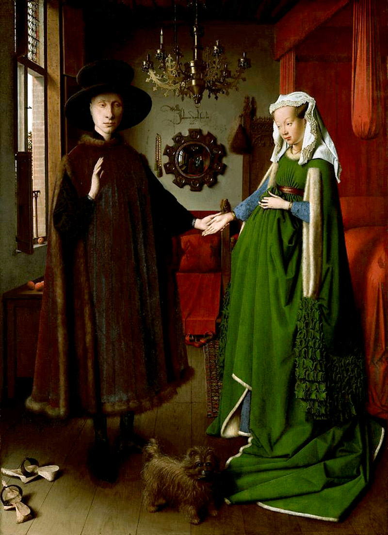 (上) 生命と多産を象徴する緑の花嫁衣装 Jan van Eyck, Giovanni Arnolfini and His Bride, 1434, oil on oak panel, 82 x 60 cm, the National Gallery, London