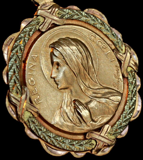 本品は「メダイ」とはいっても、信心具のレベルを超えて、「美術品」及び「宝飾品」として高く評価すべき水準に、十分に到達しています。すなわち「レジナ・チェリ」の聖母像は高名なメダイユ彫刻家の作品で、どの角度から見ても美しく素晴らしい出来栄えは、同時代の信心具を超えた美術品となっています。