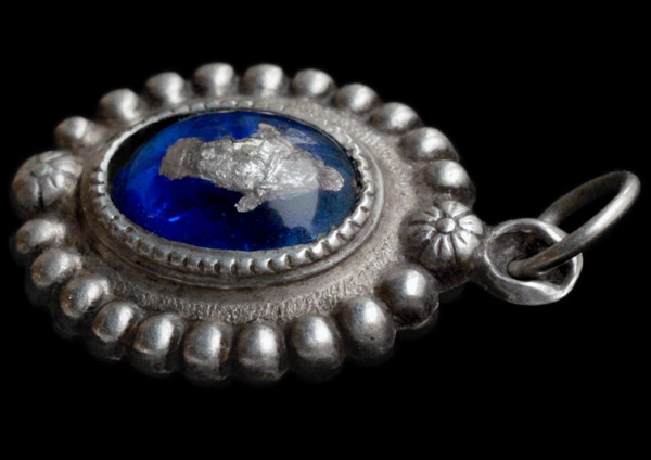 丸みのある形が愛らしい聖母と十字架のメダイ。青のガラス製カボション・ビーズと銀箔を使った手の込んだ作りで、800シルバー製の枠を取り付けています。