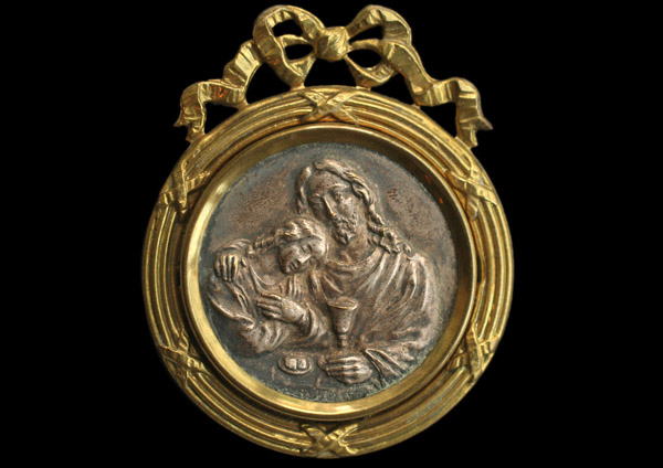 メダイの図柄は最後の晩餐のときのイエズスと使徒ヨハネで、ヨハネによる福音書 13章に記述があります。主イエズスが弟子たちのなかでも特に愛された若者ヨハネは、主の隣で過ぎ越しの食事の席に着いています。食事が始まるとき、イエズスは、まもなく自分が弟子の一人に裏切られるという予告をします。シモン・ペトロがヨハネに向かって、主が誰のことを言っておられるのか尋ねるように合図をし、ヨハネはイエズスの胸元に寄りかかったまま、「主よ、それは誰のことですか」とイエズスに訊ねています。