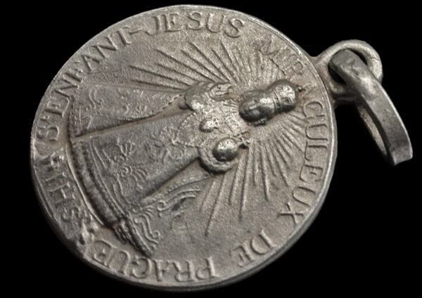 表(おもて)面にはプラハの幼子イエズスをあしらい、その足元にイエスを表すギリシア語のモノグラム IHS と、ふたりの天使を浮き彫りにしています。幼子イエズスの身長はわずか