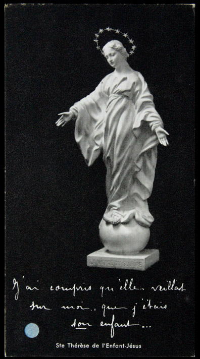 テレーズは愛読の「イミターティオー・クリスティー」("Imitatio Christi" 「キリストに倣いて」)に、「ノートル=ダム・デ・ヴィクトワール」の小聖画を挟んでいました。カルメル会に入会したいという望みを父ルイ・マルタンに伝えたとき、父は娘に小さな花を贈り、テレーズはその花を聖画に貼り付けました。亡くなる数日前、テレーズは聖画の裏に名前を書きましたが、これはテレーズの最後の署名となりました。