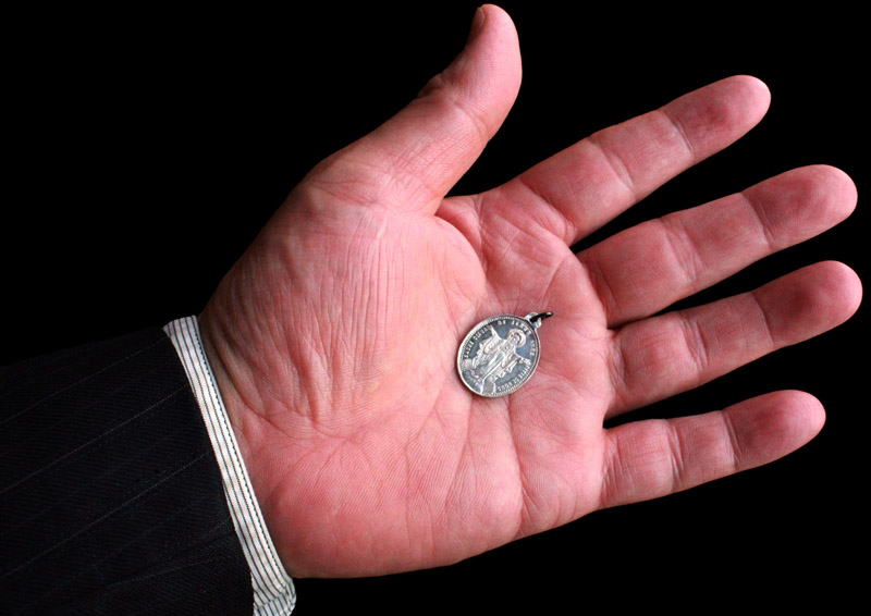 メダイ上部に突出した環状部分の付け根には、フランスにおいて銀(800シルバー)を示す「イノシシの頭」のポワンソン(poinçon 貴金属検質所が刻印する純度のマーク、ホールマーク)があります。またオルフェーヴル(orfèvre 金銀細工師)であるセザール・ブロンドーのマークは、「CとBの間に、星とフルール・ド・リス」です。本品上部の環には、これら二つのマークが重なるように刻印されています。