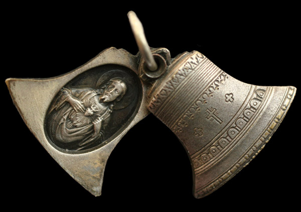 左右にずらして開くことができるロケット型のメダイ。膨らみを持った鐘の形をしており、両面とも同じ模様がインタリオ(陰刻)で表されています。メダイを開くと楕円形の窪みがあり、一方には聖心を示すイエズス・キリストが浮き彫りにされています。もう一方にはパリ、モンマルトルにあるサクレ・クールのバシリカが浮き彫りにされ、下部に「モンマルトル」(MONTRARTRE) という文字が添えられています。