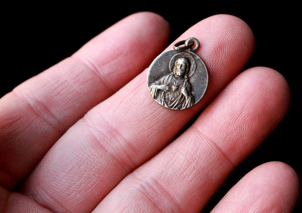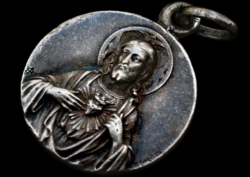 本品は直径16ミリメートルあまりのメダイですが、イエズス像の出来栄えは大型の彫刻作品に劣らず、その優れた出来栄えに驚かされます。目、鼻、口や聖心、手など、各部分のサイズは1、2ミリメートルほどしかありませんが、いずれも正確で整った形に彫られています。