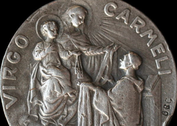 もう一方の面にはカルメル山の聖母が聖サイモン・ストックに出現する場面が浮き彫りにされています。聖母子は跪く聖人の前に雲に乗って現れ、聖母は肩布を、イエズスは茶色のスカプラリオを、それぞれ授けています。周囲にはラテン語で「カルメルのおとめ」(VIRGO