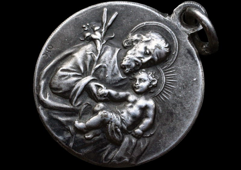 もう一方の面には幼子イエスを抱く聖ヨセフが表されています。ヨセフは伝統的イコノロジー(図像表現)にしたがって年長の男性として表されており、右腕と体の間に白百合を挟んでいます。白百合は純潔の象徴であるとともに、神に選ばれた身分の象徴であり、神の摂理に信頼する信仰の象徴でもあります。聖ヨセフならずとも、子供を持つすべての男性は子供の父、守護者として選ばれたのであり、聖ヨセフが持つ白百合は、聖人ではない我々にも神から委ねられた保護者としての身分を思い出させてくれます。