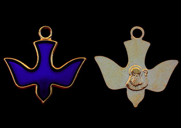 実物大 (メダイのサイズ 16.8 x 16.8 mm) 指先に載るサイズの鳩を象(かたど)った美しいメダイ。金めっきをかけた金属製で、濃色の透明ガラスでエマイユ(七宝)が施されています。いまから数十年前、20世紀半ばにフランスで製作された真正のヴィンテージ品ですが、たいへん珍しいことに、販売されることなく新品のままメダイ工房の片隅に眠っていたデッド・ストック品です。