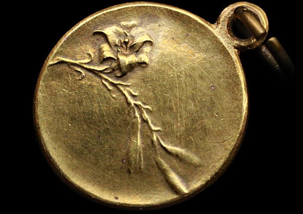 メダイの裏面にも百合が彫られています。一輪のみ咲いた花の直径は、3ミリメートルに満ちませんが、香りが感じられると錯覚するほどのリアリティで、浮き彫りに再現されています。