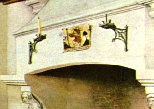 受胎告知を描いたテンペラ板絵で、暖炉の上の壁面に、上掲の版画と同じようなクリストフの彩色画が張られています。二枚目に示したのは拡大写真です。ロベール・カンパンが受胎告知を描いたこの作品は、現在ベルギー王立美術館に収蔵されています。
