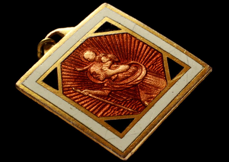 三色のエマイユ・シャンルヴェ 《アール・デコ様式による聖クリストフのプラケット》 神の愛と恩寵に守られた人生 28.0 x 25.3 mm フランス 1910