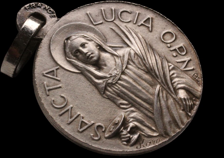 ルチアはシチリア島東岸にシラクサに住んでいた若い女性です。伝承によると、ルチアには母が立てた婚約者がいましたが、娘のルチア本人は結婚を拒み、キリストに自身を捧げて独身のままでいることを望みました。しかしながら婚約者は美しいルチアに執着し、とりわけ彼女の眼に惹かれていたため、ルチアは自ら眼を抉り出し、皿に載せて婚約者に届けたと伝えられます。