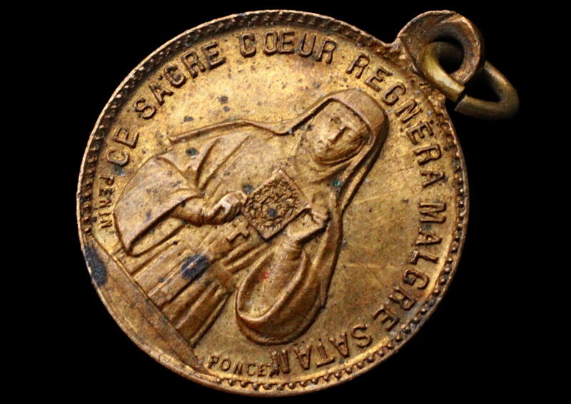 なおマルグリット=マリが列聖されるのは 1920年のことです。このメダイが制作された時点で、マルグリット=マリは福者ですので、聖人の後光はまだ表現されていません。