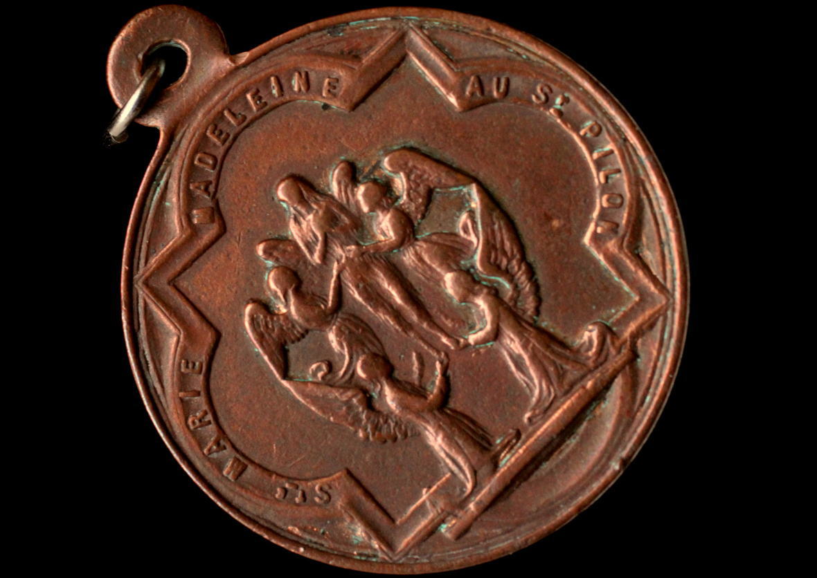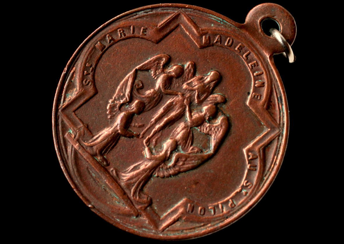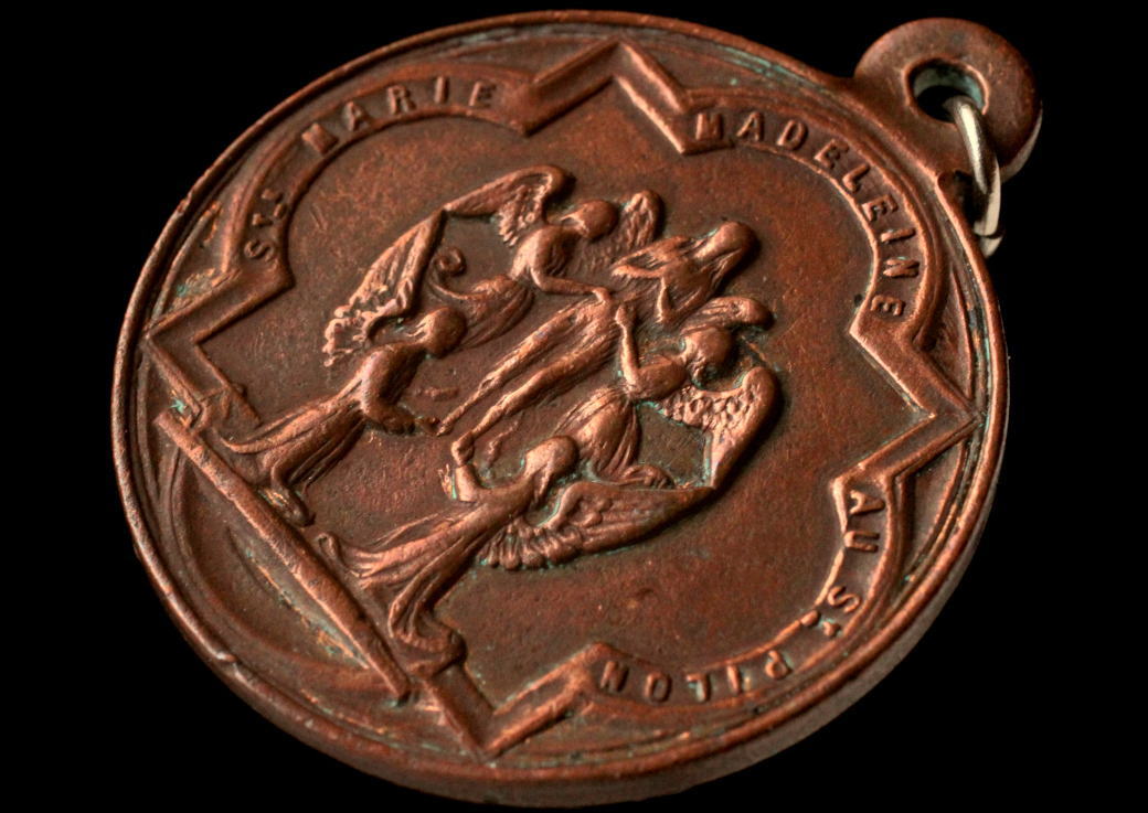 本品は百数十年前のフランスで制作された真正のアンティーク品ですが、古い年代にもかかわらず良好な保存状態です。突出部分の摩滅は本品が経てきた歳月の可視化であり、レプリカには真似のできない歴史性と個別性の現れです。ゴシック様式の窓を通して聖女を眼前に見るかのような浮き彫り彫刻は、突出部分の摩滅にも関わらず、見る者の心をマドレーヌに寄り添わせます。逆境にある人にも順境にある人にも、真に掛け替えのないものとは何かを思い起こさせる力は、本品メダイユが持つ芸術性の証しです。