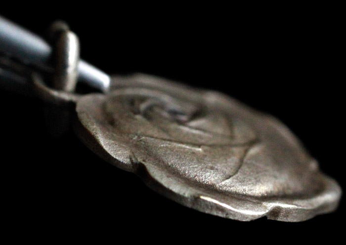 本品の薔薇は写実的でありながらも薄く作られ、花の厚みは優しいカーブを描いています。極端な突出部分が無いデザインは、身に着けると快適で、摩耗にも強く、ペンダントとして使うには理想的です。正面から見るとあたかも本物の花のような立体性を感じさせるのは、フランスのメダイユ彫刻家ならではの腕前です。