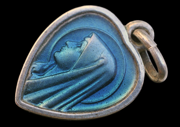 青色エマイユを施したルルドの聖母のメダイ。メダイの絵柄は、表(おもて)面がルルドの聖母の横顔、裏面が聖母出現の場面というスタンダードなものですが、ハート形をしたルルドのメダイは稀少です。このメダイがハート形をしている理由は、愛を象徴するその形によって、イエズス・キリストの聖心(神の愛)、及び聖母マリアの御心(神への愛)を思い起こさせるためです。