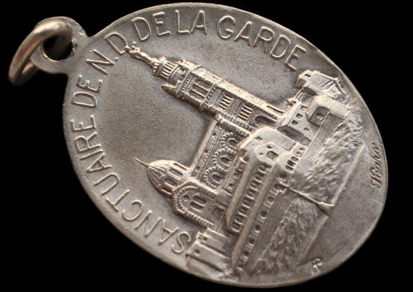 マルセイユの象徴、バジリク・ノートル=ダム=ド=ラ=ガルドの鐘楼頂上にそびえ、「ラ・ボンヌ・メール」(優しい聖母さま)として市民に親しまれる聖母子の巨像、「ノートル=ダム・ド・ラ・ガルド」(守護の聖母)のメダイ。