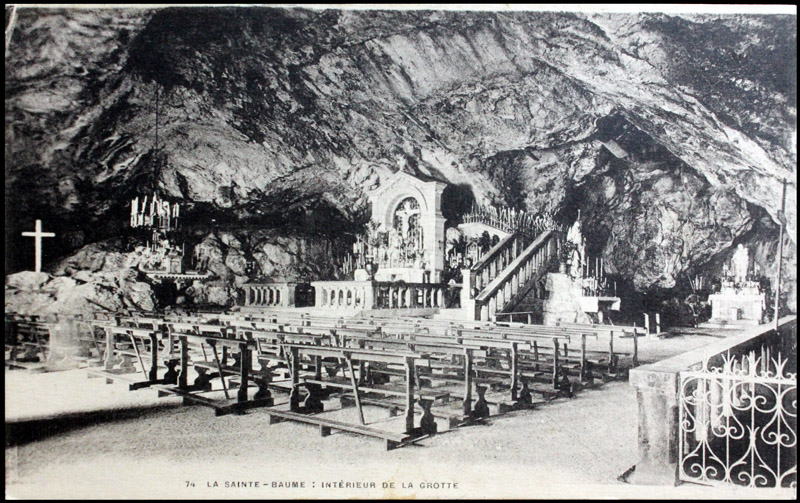 (Sainte-Baume 「聖なる洞窟」) の岩穴に隠棲して、30年間瞑想の生活を送りました。聖女は天使が運んでくる天上の食べ物だけを口にし、一日七回、毎時課に天使によって天上に上げられ、日々天上の音楽を聴きました。