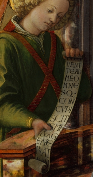 下の絵はフィリッポ・リッピによるテンペラ板絵で、ニューヨークのメトロポリタン美術館に収蔵されています。聖母子の右後ろ(向かって左後ろ)にいる天使は、ヴルガタ訳「集会書」二十四章二十六節の聖句「われを欲する汝等は皆、われに来(きた)りて、われの産み出すものにて満たされよ」
