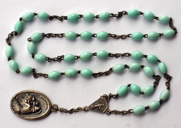 パドヴァの聖アントニウスのシャプレ ターコイズ色のガラス製ビーズ 不思議のメダイのクール付 全長 31 cm