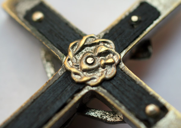 クルシフィクスは黒檀と思われる木を金属に象嵌し、打ち出し細工ではないソリッドなキリスト像を取り付けています。キリストの頭上に I.N.R.I.